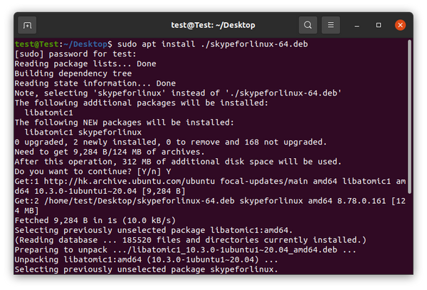 Once the download is complete, install Skype by running the following command as a user with sudo privileges :